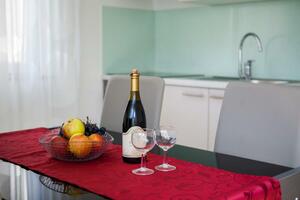 Riva Mare Apartment is the only one of its kind and offers a wonderful romantic sea view. The apartment is located right in the city center, just a few steps from the sea, restaurants and shops. The apartment consists of two rooms, a bedroom and a living room with a fully equipped kitchen. In the living room you can find a sofa bed which is used as an extra bed for two children or one adult as well. Kitchen has oven, kettle and fridge. In the apartment you will find a bathroom with a shower, toilet and washing machine.
